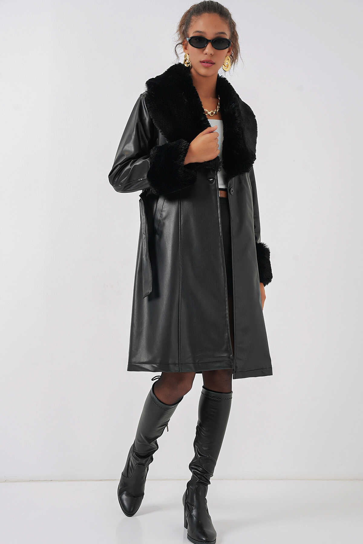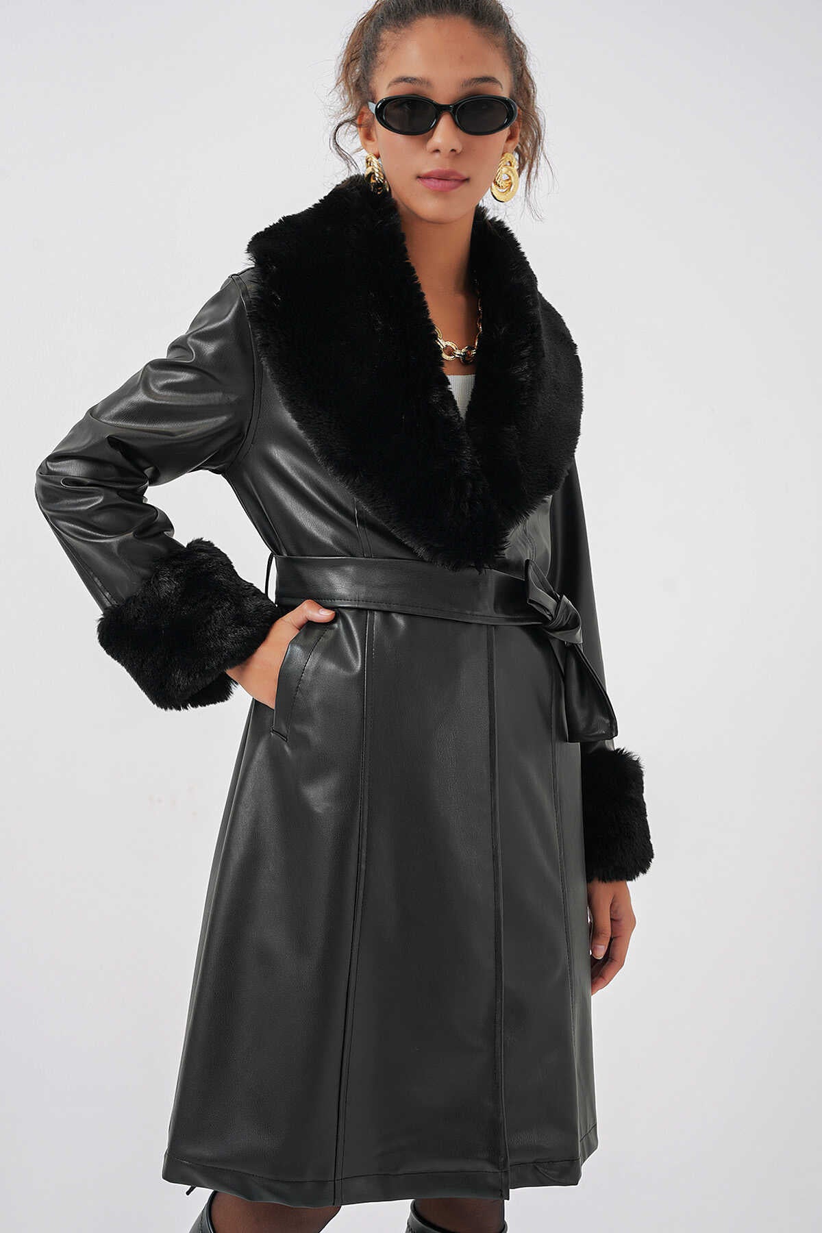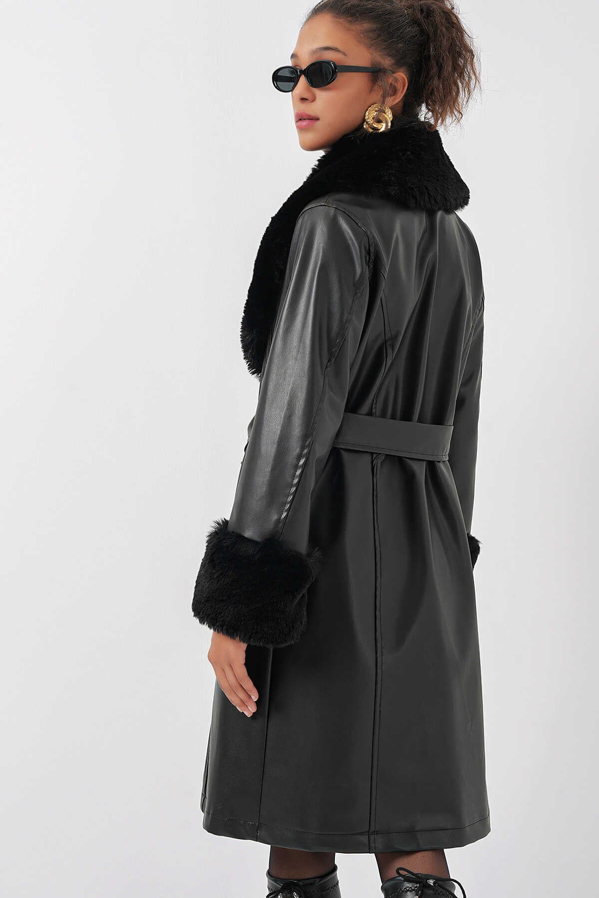 Yaka Kürklü Kemerli Deri Mont